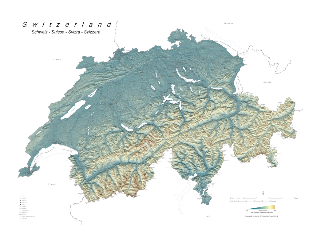 Relief map of Switzerland by Cartographer Christopher DeYoe. In PDF format.